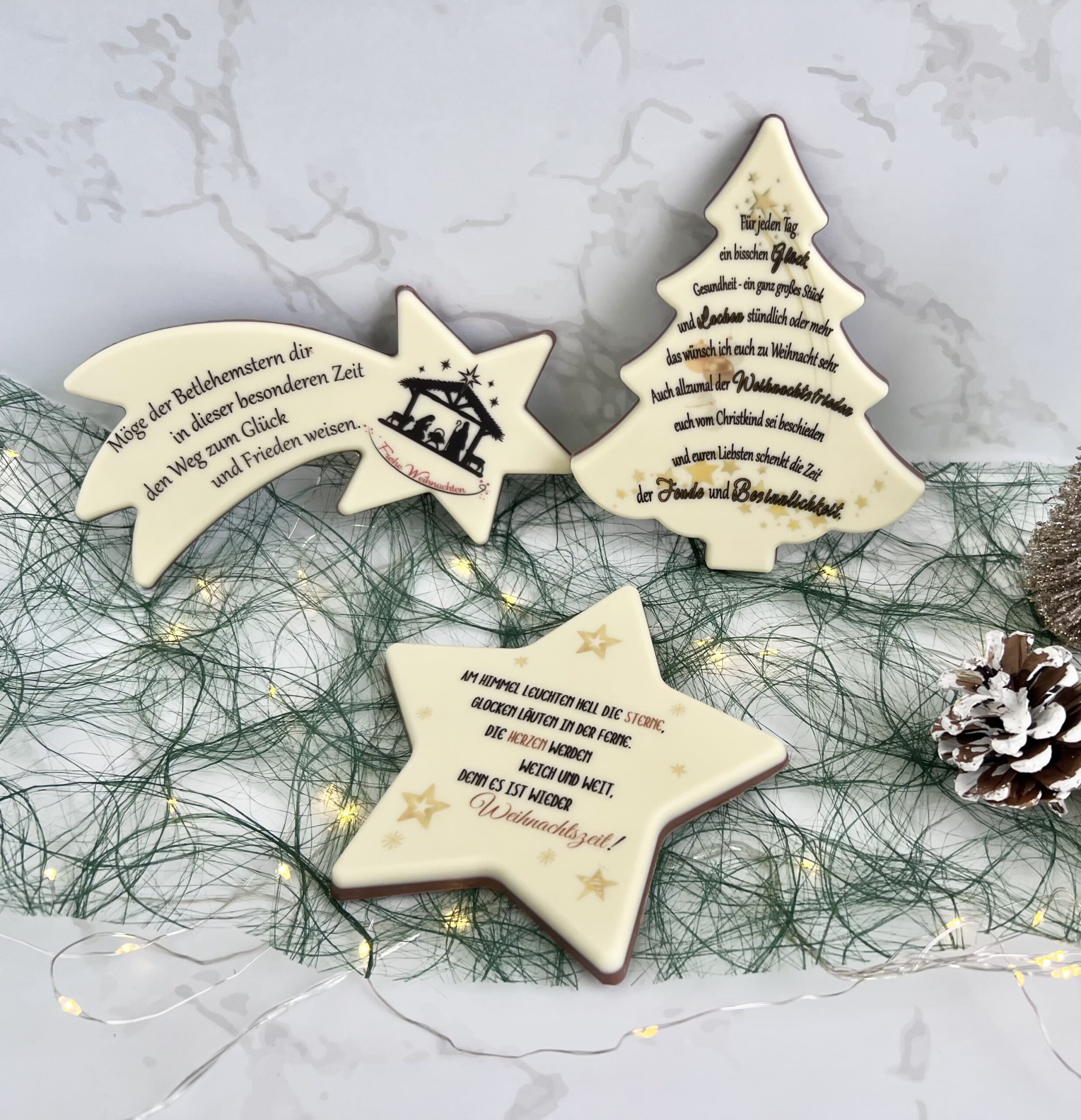 | Zutaten | Zucker, Kakaobutter, VOLLMILCHPULVER, Kakaomasse, Emulgator: SOJALECITHIN, natürliches Vanillearoma, Aroma, Farbstoffe: E160e, E132, E100, E120. |
