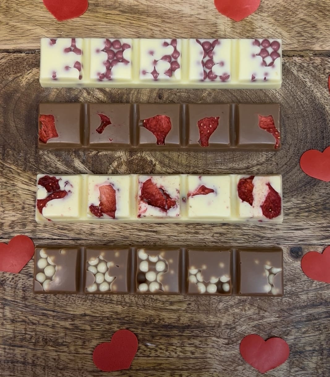 Jede personalisierte Schokolade ist ein echtes Unikat. Bei kleinen Formaten wie Schokoherzen oder Mini-Täfelchen lohnt sich die Produktion ab 6 Stück. Für größere Formate machen wir auch Einzelstücke möglich.